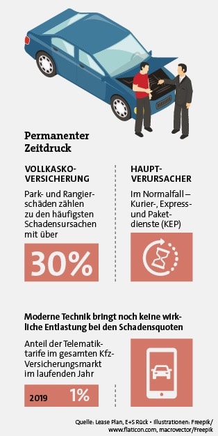 Schon jetzt sorgt der immense Zeitdruck dafür, dass unkonzentrierte Fahrer im Dauerstress die ein oder andere Beule zusätzlich in ihren Lieferwagen rumsen. Nicht überraschend also, dass die KEP-Branche bei den Flottenversicherern im Vergleich mit allen anderen Kunden die allerrötesten Zahlen in den Büchern hinterlassen.