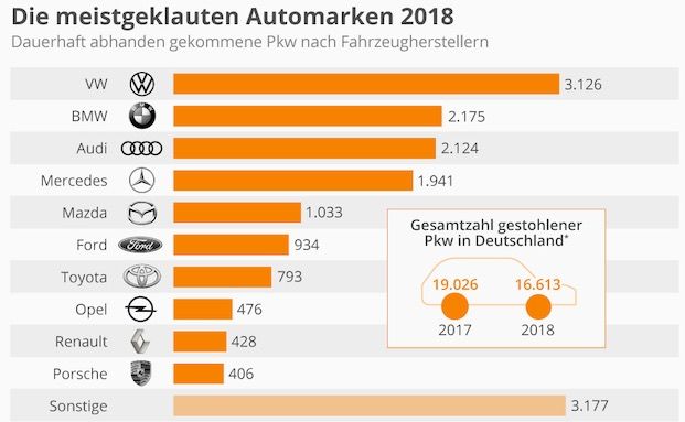 Das sind doch mal gute Nachrichten: 2018 klauten Diebe weniger Autos als noch im Jahr zuvor, meldet das Bundeskriminalamt. 16.600 Fahrzeuge sind laut der Statistik „dauerhaft abhanden gekommen“. 2017 waren es gut 19.000. Welche Automarken die Kriminellen dabei am häufigsten mitgehen lassen, zeigt die Grafik.