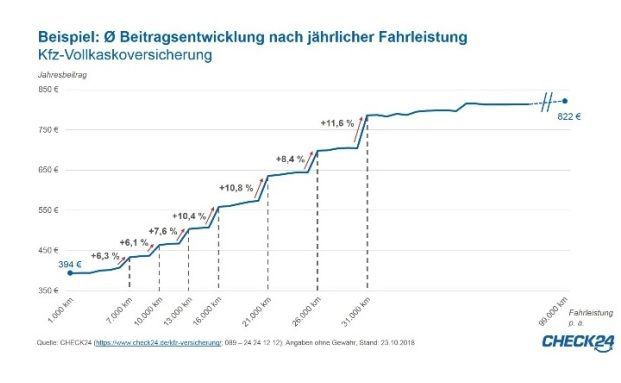 Das zeigt eine Beispielrechnung des Vergleichsportals Check24. In dem herangezogenen Fall zahlt der Autofahrer mit Vollkaskoschutz für eine versicherte Fahrleistung von 30.000 Kilometern 705 Euro jährlich und für 31.000 Kilometer 786 Euro. Danach ist die Steigerung deutlich geringer.