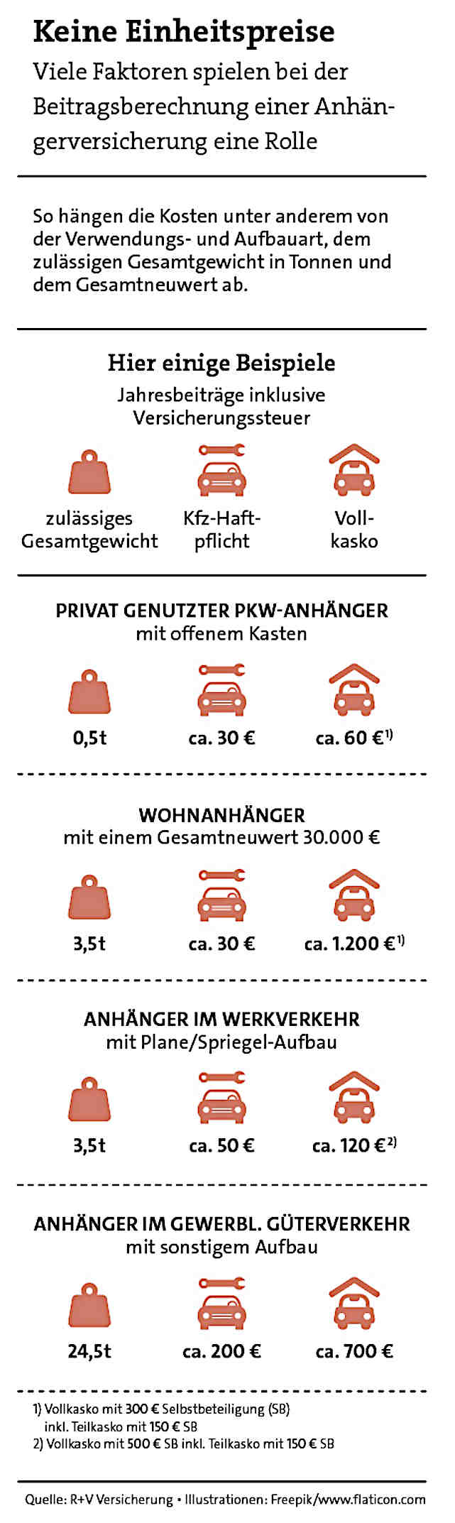 Der Beitrag richtet sich bei der Anhängerversicherung nach verschiedenen Faktoren, vor allem nach der Bauart des Anhängers, ob es also zum Beispiel ein Kipphänger oder ein Kofferanhänger ist. Auch spielt es eine Rolle, wann der Anhänger zugelassen wurde, welche Nutzlast er hat, und welches Gesamtgewicht zulässig ist. Einige Beitragsbeispiele für verschiedene Anhänger zeigt die Grafik.