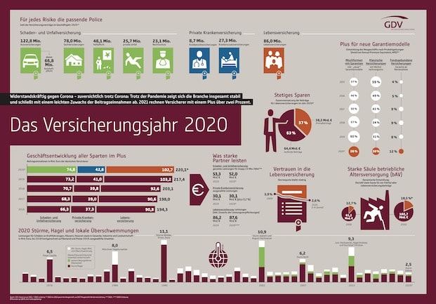 „Widerstandskräftig gegen Corona – zuversichtlich trotz Corona“, so lautete das Fazit, das der Gesamtverband der Deutschen Versicherungswirtschaft (GDV) am Mittwoch anlässlich seiner digitalen Jahresmedienkonferenz 2021 in Berlin zog. Wie der GDV das abgeschlossene Geschäftsjahr 2020 bildhaft beurteilt, zeigt diese Infografik.