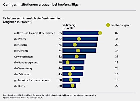 70 Prozent der Befragten haben danach sehr viel oder ziemlich viel Vertrauen in die Gesetze und Gerichte hierzulande. Auf einen besseren Wert kommen nur kleine und mittlere Unternehmen sowie die Polizei. In der Trendanalyse der vergangenen Jahre zeigt sich, dass das Vertrauen in die Justiz relativ stabil ist. So bewegt sich das Vertrauen in die Gesetze seit drei Jahren um die 70 Prozent. Dagegen zeigt sich, dass unter den Impfverweigerern nur 27 Prozent sehr viel oder ziemlich viel Vertrauen in die Gesetze und 34 Prozent in die Gerichte haben.