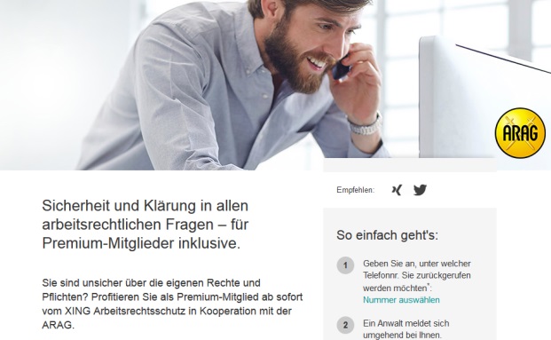 Das Berufsnetzwerk Xing bietet seinen Premium-Mitgliedern ab sofort ein kleines Schmankerl an. In Kooperation mit der Arag bekommen die Kunden nun automatisch eine kostenlose Xing Arbeitsrechtsschutzversicherung.