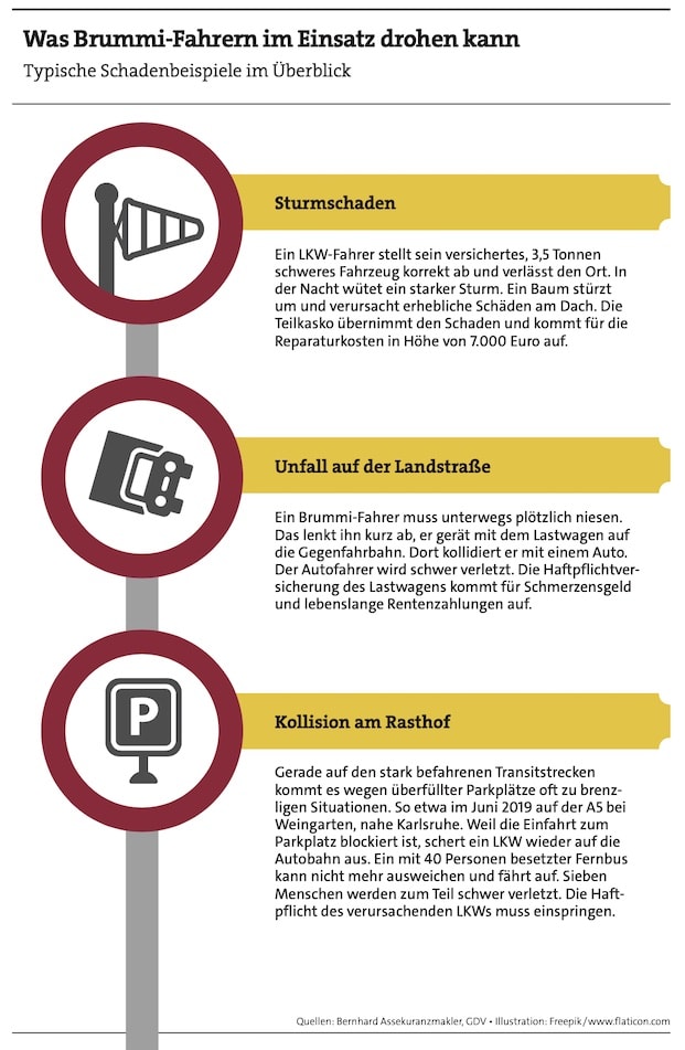Doch so erfreulich diese Entwicklung ist – das Risiko für Mensch, Material und Maschine, auf den bundesdeutschen Fernstraßen buchstäblich auf der Strecke zu bleiben, ist hoch. Unwetter, Unfälle oder Vandalismus sind für jeden Brummi-Fahrer ganz reale Schadenereignisse (siehe Grafik). Um die zahlreichen Gefahren, die auf und abseits der Straße drohen, abzusichern, ist eine gewerbliche LKW-Versicherung unverzichtbar. Doch worauf kommt es bei einem Vergleich der unterschiedlichen Tarifwerke in Haftpflicht-, Teilkasko- und Vollkaskoversicherung an? „Eine gewerbliche Kraftfahrzeugversicherung unterscheidet sich im Grundgerüst nicht wesentlich von einer privaten Kfz-Versicherung“, sagt Versicherungsmakler Mario Müller. „Die Kfz-Haftpflicht sichert genauso Schäden an einem dritten Fahrzeug oder einer Person ab, der Teilkasko-Anteil versichert Diebstahlschäden oder Schäden durch Wildunfälle am Fahrzeug, und wer eine Vollkaskoversicherung abgeschlossen hat, ist finanziell auch gegen Eigenschäden abgesichert“, erklärt der Gründer und Geschäftsführer des Maklerunternehmens transparent-beraten.de aus Berlin.