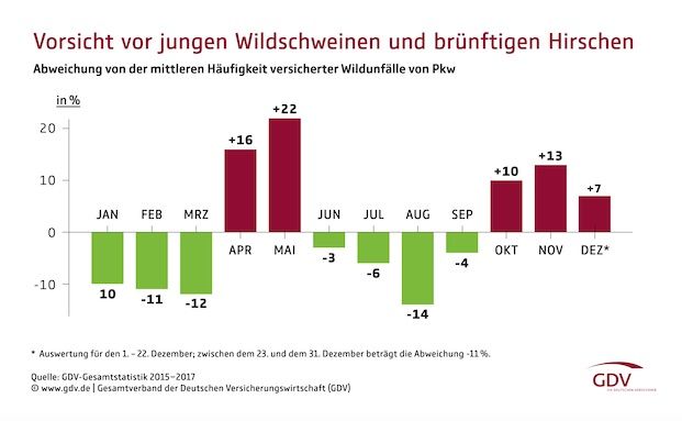 Laut der Schadenexperten des GDV ist die Gefahr von Wildunfällen in den Monaten April und Mai und von Oktober bis Dezember am höchsten. Im Frühjahr sorgen vor allem Wildschweinrotten mit ihren Frischlingen für eine um rund 20 Prozent höhere Unfallgefahr. Zum Jahresende kommt es zu vielen Unfällen mit Hirschen, die in ihrer Brunftzeit sehr aktiv sind. Wie aus der GDV-Statistik weiter hervorgeht, zahlten die Versicherer 2018 für jeden Wildunfall mit einem Pkw im Schnitt mehr als 2.800 Euro. Insgesamt stiegen die wirtschaftlichen Schäden durch Wildunfälle auf 757 Millionen Euro (plus zwei Prozent).