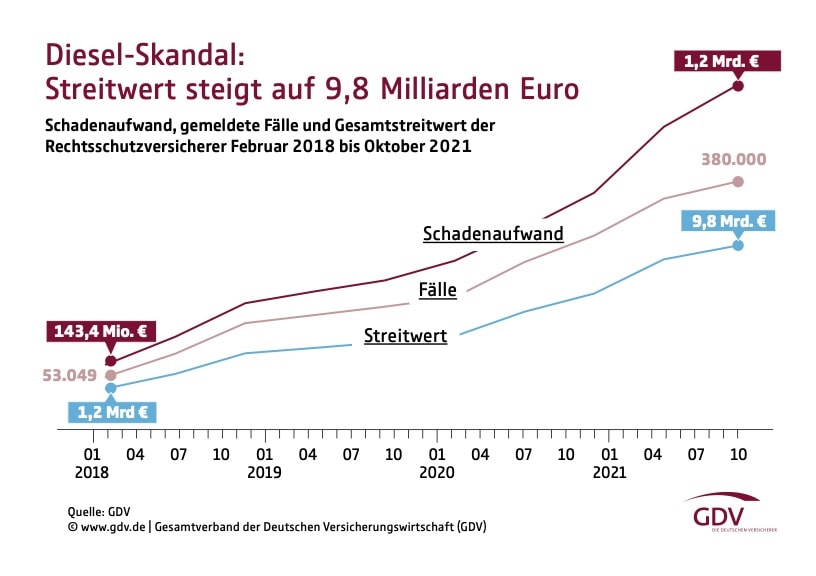 Damit bleibe der Dieselskandal „das teuerste Schadenereignis in der Rechtsschutzversicherung überhaupt“, so Asmussen weiter. Laut dem Verband nahmen bis Ende Oktober rund 380.000 Kunden ihre Rechtsschutzversicherung im Streit mit Autoherstellern wegen mutmaßlich manipulierter Abgaswerte in Anspruch. Das heißt im Klartext: Allein seit Mai dieses Jahres sind mehr als 25.000 Fälle hinzugekommen.