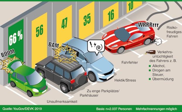 Als weitere Ursache für Parkschäden geben die Deutschen Hektik und Stress an (47 Prozent), Fahrfehler (35 Prozent) sowie Verkehrsuntüchtigkeit des Fahrers etwa durch Alkohol, Drogen oder Übermüdung (16 Prozent). Nur 10 Prozent meinen, dass risikofreudiges Fahren ein Grund sein könnte.