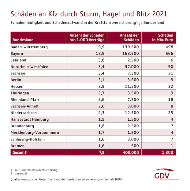 In Zahlen ausgedrückt, hat die Branche im vergangenen Jahr rund 450.000 Schäden in Höhe von 1,7 Milliarden Euro an versicherten Kraftfahrzeugen gezählt. Davon entfielen laut GDV rund 1,3 Milliarden Euro auf Kfz-Schäden durch Sturm, Hagel und Blitz. Die restlichen 400 Millionen Euro wurden durch Überschwemmungen verursacht.