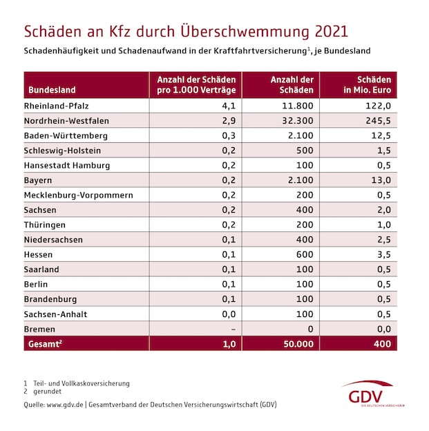 Dementsprechend führt Rheinland-Pfalz die regionale GDV-Naturgefahrenbilanz 2021 bezüglich Überschwemmungen an, mit im Schnitt 4,1 Schadenmeldungen auf 1.000 kaskoversicherte Fahrzeuge. Dahinter folgt Nordrhein-Westfalen mit 2,9 Schadenmeldungen. Bremen steht am Ende dieser Liste, hier wurden die Autofahrer nahezu von Überschwemmungen verschont (siehe erste Tabelle).