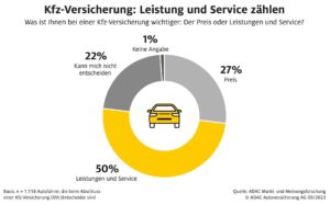 Auf die Frage, was Autofahrern bei ihrer KFZ-Versicherung wichtiger ist – Preis oder Leistungen und Service –, antworteten 50 Prozent mit Leistungen und Service und 27 Prozent mit dem Preis. 22 Prozent können sich bei dieser Frage nicht entscheiden. Besonders preissensibel sind junge Autofahrer. Doch auch in der Altersgruppe zwischen 18 und 29 Jahren gibt eine Mehrheit von 40 Prozent Leistungen und Service den Vorzug. 30 Prozent sehen hingegen den Preis als wichtiger an.