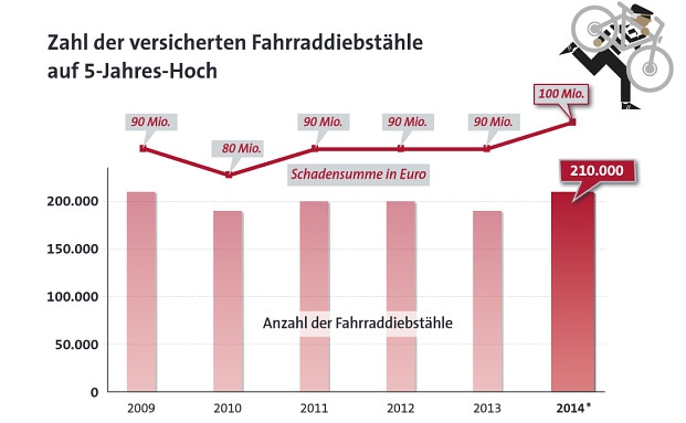 210.000 Fahrräder haben Diebe im vergangenen Jahr geklaut. Das ist der höchste Wert seit fünf Jahren. Die Hausratversicherer kommt das teuer zu stehen, sie mussten ihren Kunden im vergangenen Jahr 100 Millionen Euro zahlen.