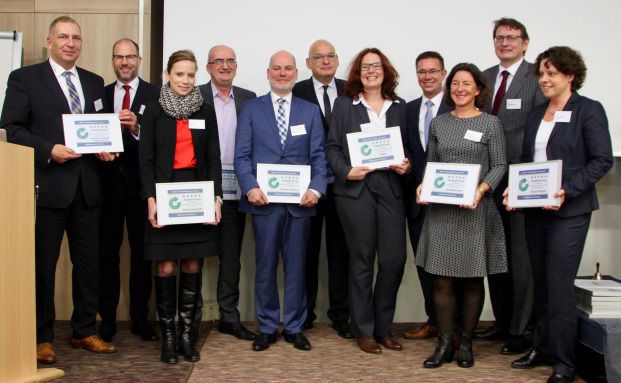 Die Preisträger von links nach rechts: Andreas Gutschka und Henning Kuhse (Kravag), Kristina Benz (Continentale), Manfred Zimpelmann (BGV/Badische), Florian Hamsch (Europa/Europa-go), Karl-Heinz Kindsvogel (VPV), Silke Hohmann (Allianz), Frank Kersten (AMC), Ulrike Brams-Ruckdeschel (Die Bayerische), Eva Bednarski (Zurich).