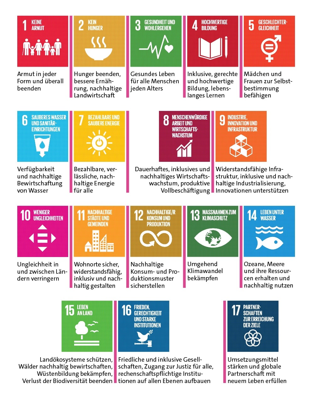 Weil der Klimawandel die Welt, wie wir sie kennen, bedroht, ist sich die Staatengemeinschaft weitgehend einig: Es muss etwas passieren, wir alle müssen ökologischer, sozialer und verantwortungsvoller handeln. Um hier einen Leitfaden zu haben, was das eigentlich genau bedeuten soll, haben 193 Staaten der Vereinten Nationen im September 2015 die Agenda 2030 für nachhaltige Entwicklung auf die Beine gestellt. Im Kern geht es um 17 Nachhaltigkeitsziele, die sogenannten Sustainable Development Goals oder kurz SDGs. Sie reichen von der Abschaffung von Armut über die Geschlechtergerechtigkeit bis hin zum Schutz der Meere (siehe Grafik unten).