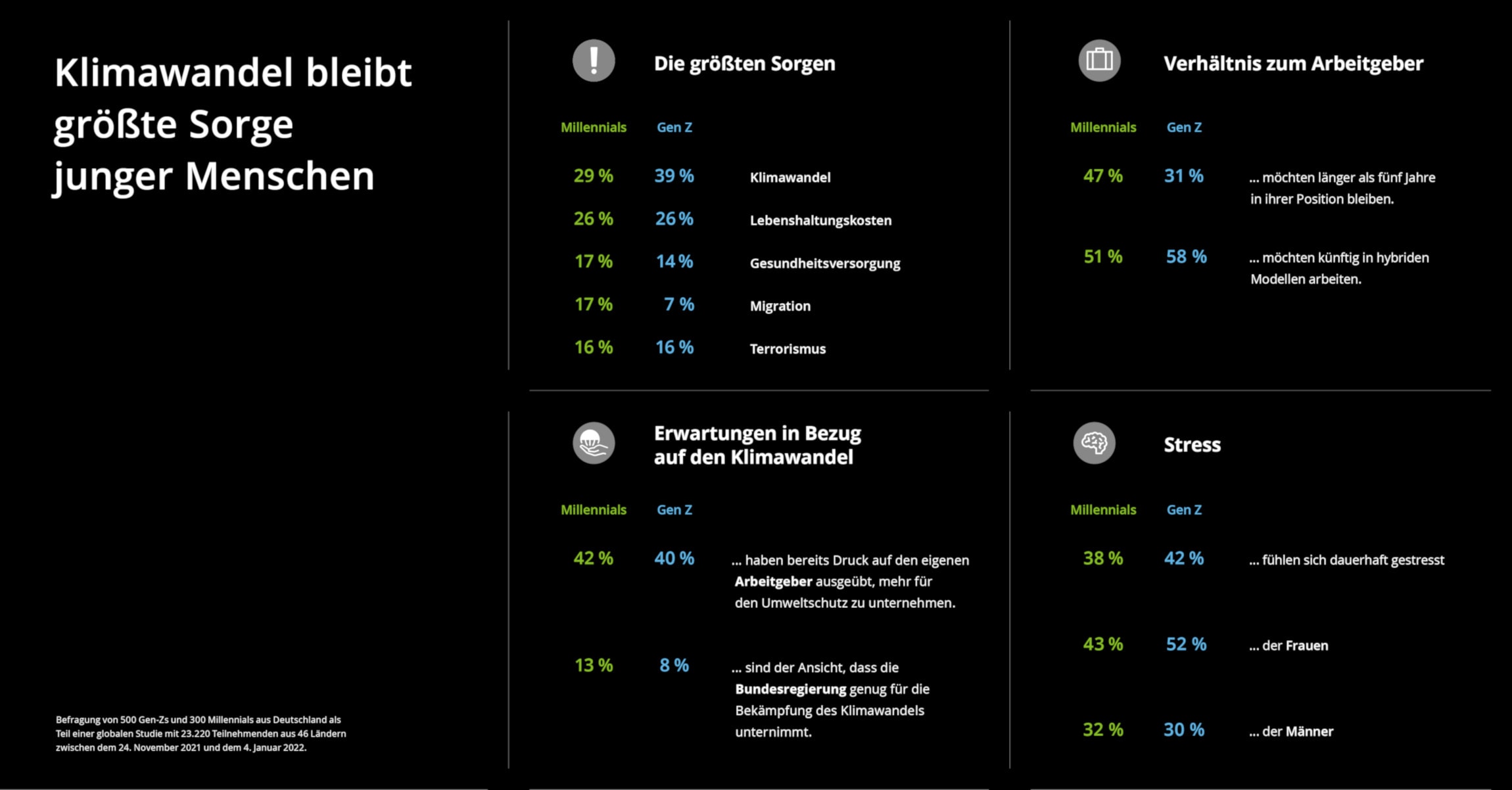 Das geht aus der elften Umfrage der Wirtschaftsberatung Deloitte hervor, der „Deloitte Millennial Survey 2022“. Darin kommen rund 14.800 Menschen aus der Generation Z und rund 8.400 Millennials aus 46 Ländern zu Wort. Einschränkend muss man jedoch dazusagen, dass die Umfrage stattfand, bevor Russland den Krieg mit der Ukraine begann und die Wirtschaft in eine Energiekrise geriet.