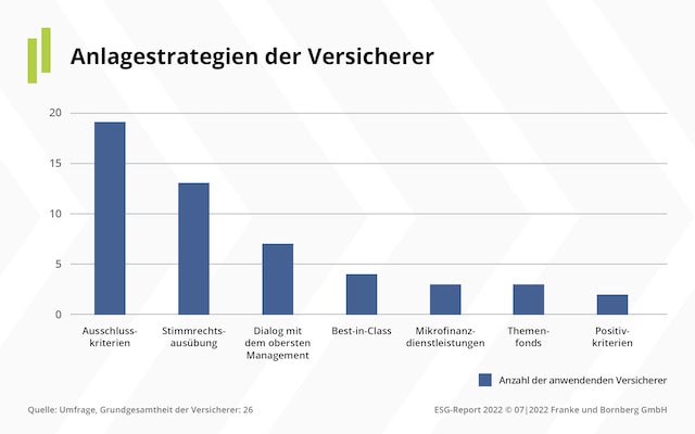 Strategien für nachhaltige Kapitalanlagen gebe es einige, so das Fazit des ESG-Reports. Am weitesten verbreitet seien Ausschlusskriterien, auch Negativkriterien genannt. Sie definieren vorab, in welche Staaten, Branchen oder Unternehmen die Versicherer nicht investieren dürfen. 19 von 26 Versicherern setzen auf diese Strategie.