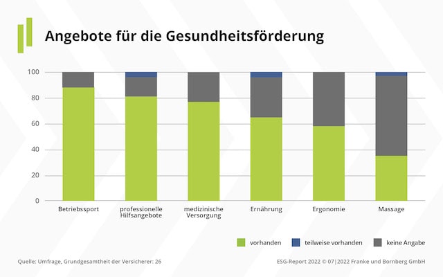 Im sozialen Bereich untersuchten die Analysten das Innenverhältnis der Versicherer, also unter anderem die Arbeitsbedingungen und Sozialleistungen für Beschäftigte – etwa Angebote zur betrieblichen Gesundheitsförderung. Spitzenreiter seien hier der Betriebssport und professionelle Hilfsangebote (siehe Grafik).