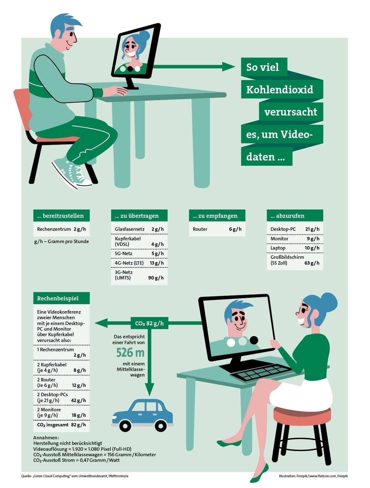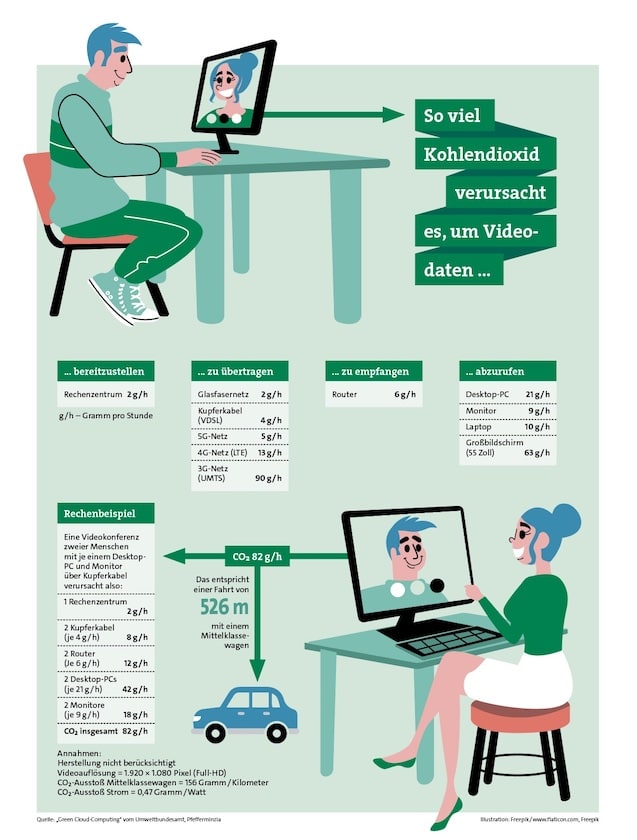 Eine Studie im Auftrag des Umweltbundesamts belegt: Um so viel Kohlendioxid zu verursachen wie eine Stunde Videogespräch, braucht man mit einem Benziner nicht einmal einen Kilometer zu fahren (siehe Grafik unten). Und das ist nur mit dem deutschen Strommix und nicht etwa mit Ökostrom berechnet und beruht auf Technik aus dem Jahr 2020. Heute dürfte die Bilanz noch besser ausfallen. Wer zusätzlich sparen will, überträgt die Videos nicht in Full-HD mit 1.920 mal 1.080 Bildpunkten oder gar in 4K, sondern drosselt sie. Auch ein Bild aus 1.280 mal 720 Pixeln ist hübsch anzuschauen, verringert aber die Datenrate gegenüber Full-HD um beinahe die Hälfte.
