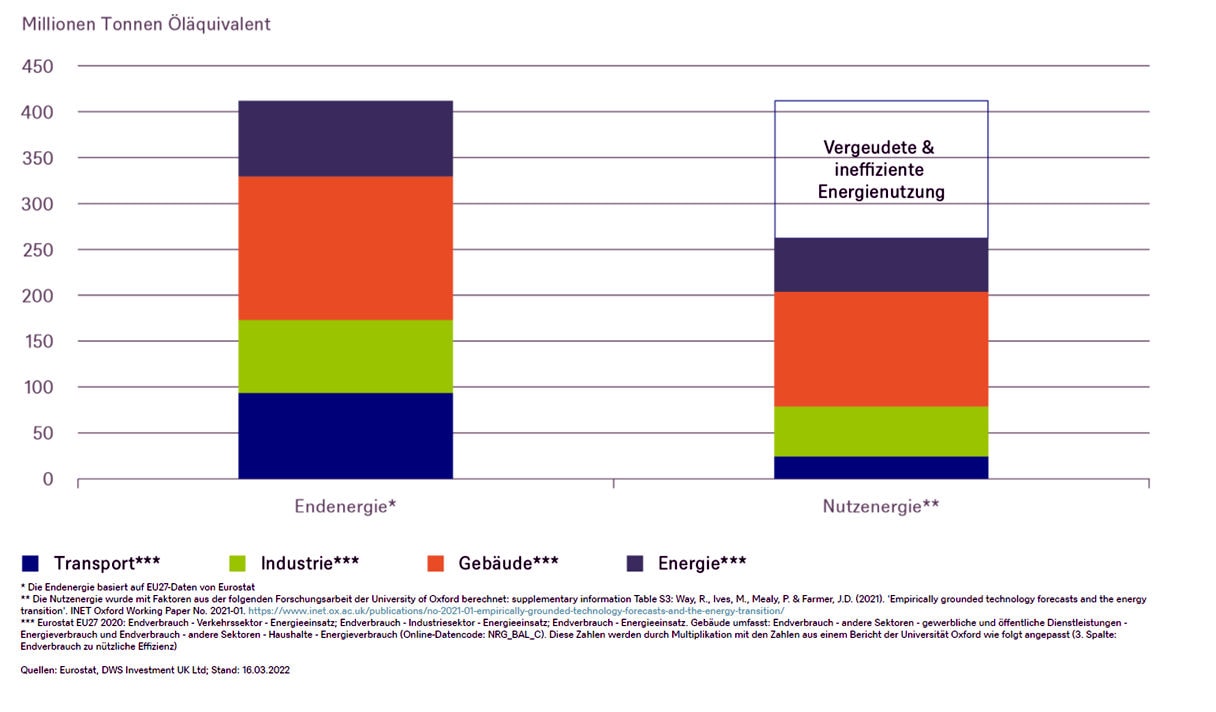 Die Fondsgesellschaft DWS zeigt in einer Grafik, wie viel Energie heutzutage tatsächlich noch vergeudet wird. Noch immer werden leere Gebäude geheizt. Beim Autofahren gehen drei Viertel der Energie als Abwärme und Reibung verloren. Vom lächerlichen Wirkungsgrad klassischer Glühlampen oder Halogenlampen einmal ganz zu schweigen.