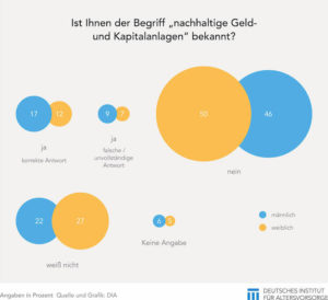 Für ihre repräsentative Studie „Wie halten es die Anleger mit der Nachhaltigkeit?“ hat das Deutsche Institut für Altersvorsorge (DIA) rund 3.000 Personen ab 16 Jahren befragt. Es zeigt sich: Nur 14 Prozent der Befragten wissen, was sich bei der Geldanlage hinter dem Begriff „Nachhaltigkeit“ verbirgt. Männer glauben dabei etwas häufiger, sich auszukennen – unabhängig davon, ob sie tatsächlich eine richtige Erklärung für nachhaltige Kapitalanlagen liefern können.
