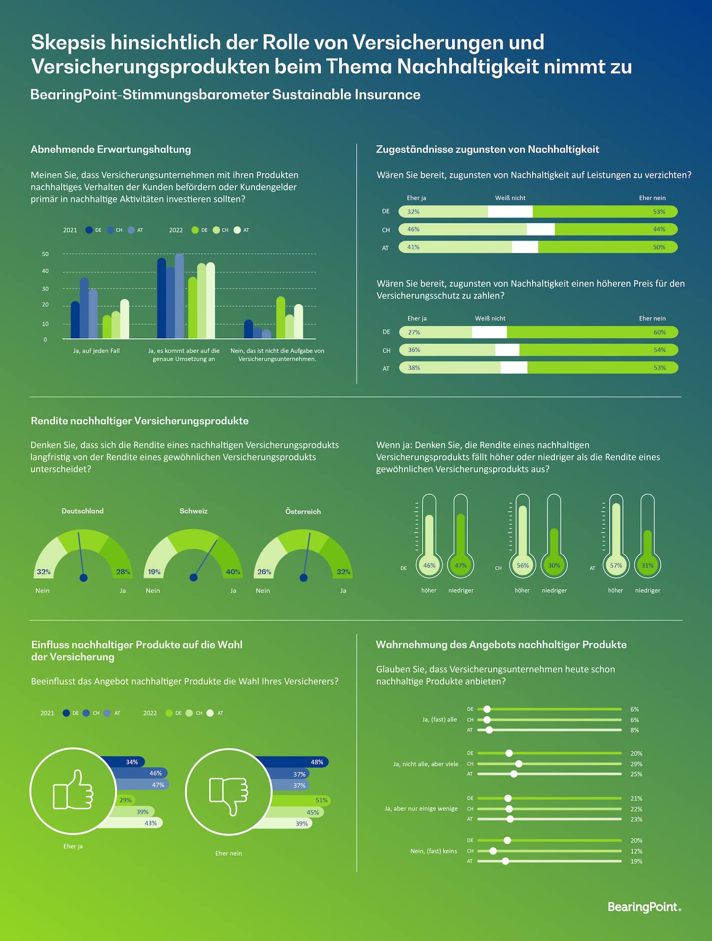 Die größere Skepsis deutscher Verbraucher im Vergleich zu Versicherungskunden in Österreich und der Schweiz zeigt sich laut Bearing Point auch im Hinblick auf die Beurteilung von nachhaltigen Anlageprodukten von Versicherungen. So ist in Deutschland der Anteil derjenigen, die im Vergleich zu herkömmlichen Anlageprodukten bei nachhaltiger Ausrichtung langfristig mit einer niedrigeren (47 Prozent) und einer höheren Rendite (46 Prozent) rechnen, nahezu gleich verteilt. Anders in Österreich und der Schweiz: Mit 57 Prozent der Österreicher und 56 Prozent der Schweizer rechnen deutlich mehr Verbraucher mit einer höheren Rendite nachhaltiger Versicherungsprodukte als in Deutschland.