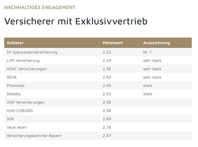 Unter den Versicherern liegt die SV Sparkassenversicherung an der Spitze der Tabelle der Versicherer mit Exklusivvertrieb. Es folgen LVM, ADAC Versicherungen und DEVK mit einem „sehr starken“ Ergebnis.