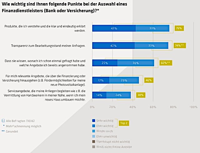 Bei der Frage nach dem wichtigsten Kriterium für die Wahl ihrer Bank oder Versicherung, rangieren klare Produkterklärungen (76 Prozent) sowie die Transparenz (74 Prozent) ganz oben. Insbesondere zum Bearbeitungsstand ihrer Anliegen wollen die Befragten informiert sein.