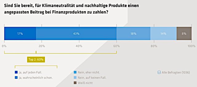 Auch wenn über die Hälfte der Finanz- und Versicherungsdienstleister Nachhaltigkeit bereits in ihrer Unternehmenskultur integriert haben, mangelt es aus Sicht der Kundinnen und Kunden an transparenter Kommunikation dazu, lautet ein weiteres Studienergebnis. Denn: Für die meisten gehören nachhaltige Produkte im Bereich Banken (85 Prozent) und Versicherungen (87 Prozent) noch nicht zum Standard-Portfolio.