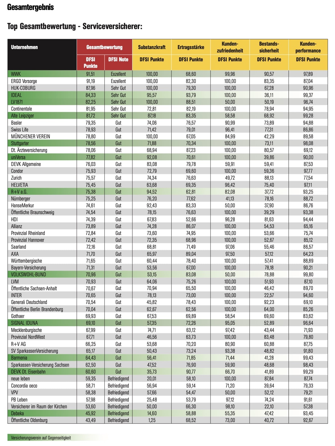 Um ein Lagebericht der Branche zu zeichnen, untersuchte das DFSI fünf Bereiche: die Substanzkraft jedes Lebensversicherers, seine Ertragsstärke, die Kundenzufriedenheit, die Bestandsicherheit sowie die Kundenperformance. Dabei zeigte sich, dass zwölf Lebensversicherer es nicht schaffen, die geforderten gesetzlichen Solvabilitätsquoten ohne Hilfe der derzeit noch zulässigen Übergangsmaßnahmen zu erreichen. 22 der 60 untersuchten Versicherer (darunter 52 Serviceversicherer, 4 Direkt- und Biometrieversicherer sowie 4 Run-Off-Versicherer) gelang es nicht, eine Rohüberschussmarge von mindestens 1,0 Prozent zu erwirtschaften.