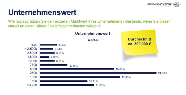 Für die Vermittlerinnen und Vermittler, die ihren Ruhestand planen, ist die Frage des Bestandsverkaufs wesentlich. Hier geht die Schere weit auf. Jeder neunte befragte Vermittler geht von einem aktuellen Unternehmenswert von mindestens einer Million Euro aus. Auf der anderen Seite schätzen 38,7 Prozent, dass sie maximal 100.000 Euro bei einem aktuellen Verkauf erzielen würden. Der durchschnittliche Wert der Bestände liegt bei 390.000 Euro.