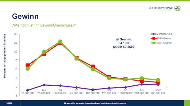 „Die freien Vermittlerinnen und Vermittler konnten durch den raschen und flächendeckenden Einsatz von Online- und Videoberatung ihr Geschäft in der Pandemie überwiegend behaupten und sogar ausbauen“, sagt AfW-Vorstand Frank Rottenbacher. „Es bleibt aber dabei, dass ein Gewinn von durchschnittlich 64.000 Euro, von dem auch die eigene Altersvorsorge bestritten werden muss, nicht für eine Neiddiskussion taugt, wie sie die Politik immer gern anstimmt.“
