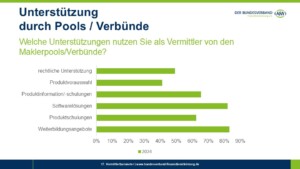 Die Mehrzahl der Vermittler nutzt außerdem Produktinformationen (65,3 Prozent) und Produktschulungen (62,5 Prozent). Als vergleichsweise weniger relevant gelten eine rechtliche Unterstützung (49,2 Prozent) und das Angebot einer Produktvorauswahl durch den Pool oder Verbund (41,1 Prozent).