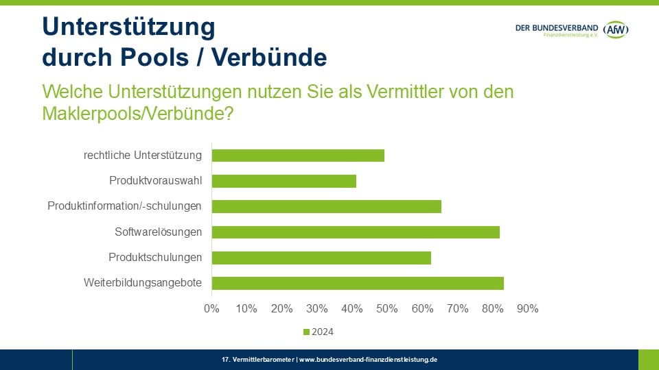 Auf die Frage, welche Angebote von Pools und Verbünden sie konkret nutzen, stehen Weiterbildungsangebote in der Gunst der Vermittler ganz oben. Sie werden von 83,1 Prozent der Pool-und Verbundpartner in Anspruch genommen. Knapp dahinter folgen Softwaretools (82,0 Prozent), die für eine effektive und rechtssichere Beratung praktisch wichtig sind.
