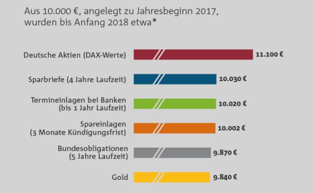Und wer auf Bundesanleihen setzte, musste sogar Verluste hinnehmen, da die Kurse der Wertpapiere an den Börsen in der Breite sanken. Fünfjährige Bundesobligationen zum Beispiel verloren gut ein Prozent. Auch mit dem Goldpreis ging es bergab: Betrachtet man die Entwicklung in Euro, so sank der Wert des Edelmetalls von Anfang 2017 bis Anfang 2018 um etwas mehr als ein Prozent.