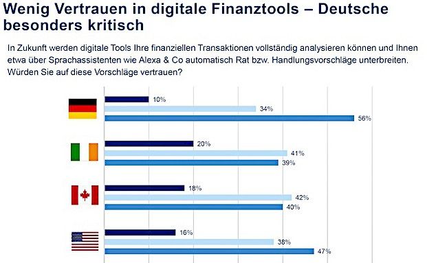 Die Deutschen haben eher weniger Vertrauen in Finanztools. Der dunkelblaue Balken steht für die Antwort „Auf jeden Fall/Eher ja“, der hellblaue für die Antwort „teils/teils“ und der mittelblaue für die Antwort „Eher nicht/sicher nicht“.