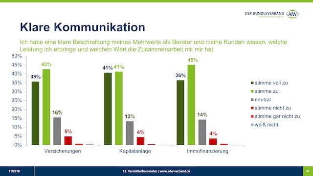 Dabei stehen die Versicherungsvermittler eigentlich für eine offene Kommunikation mit ihren Kunden. Der Aussage „Ich habe eine klare Beschreibung meines Mehrwerts als Berater und meine Kunden wissen, welche Leistung ich erbringe und welchen Wert die Zusammenarbeit mit mir hat“, stimmten 79 Prozent zu (Kapitalanlagevermittler: 82 Prozent, Immobilienfinanzierungsvermittler: 81 Prozent). „Das Ergebnis zeigt, dass sich Vermittler des Wertes Ihrer Dienstleistung mehr und mehr bewusst sind und bereit sind, diese offen beim Kunden anzusprechen“, sagt Rottenbacher.