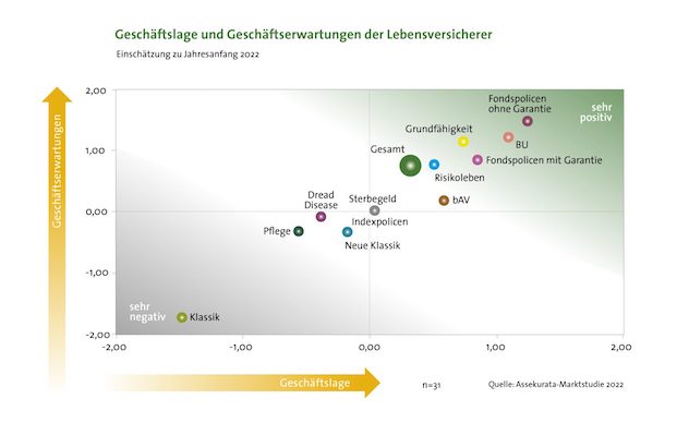 Doch natürlich vermag niemand zu sagen, welche politischen und wirtschaftliche Verwerfungen infolge des Krieges noch zu erwarten sind und wie tiefgreifend sie auf hiesige Wirtschaftsbranchen durchschlagen. Das alles vorangestellt, lässt sich sagen, dass die Versicherungswirtschaft mit einer gehörigen Portion Optimismus ins Jahr 2022 gestartet ist: „Die Lebensversicherer schauen wieder optimistischer auf ihre Geschäftssituation“, berichtet Lars Heermann, Bereichsleiter bei Assekurata – das gelte zumindest für diejenigen Gesellschaften, die Assekurata im Rahmen ihrer aktuellen Marktstudie zu Überschussbeteiligungen und Garantien, zu Jahresbeginn ihre Einschätzung zur aktuellen Geschäftslage und den künftigen Geschäftserwartungen mitgeteilt hätten.