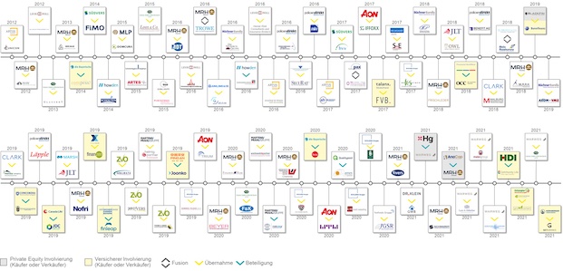 Neben der starken Konsolidierung der Makler untereinander, denken auch zunehmend Versicherer über eine oder weitere Beteiligungen an Maklerunternehmen nach. Bedeutende Transaktionen beziehungsweise Beteiligungen in diesem Bereich sind jedoch in letzter Zeit überschaubar, während vor einigen Jahren Beteiligungen an Finanzvertrieben wie AWD (Swiss Life Select) oder MLP sowie an Pools wie BCA für Aufsehen gesorgt hatten. Aktuellere Beispiele von Versicherer-Zukäufen oder Beteiligungen an Maklerunternehmen sind unter anderem die Great-West Lifeco (Muttergesellschaft der Canada Life Deutschland) an der JDC Group (März 2019) oder die Allianz mit ihrer Beteiligung an Finanzen.de durch ihre Investmentgesellschaft Allianz X (Mai 2019).