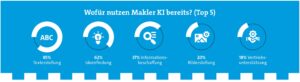 Künstliche Intelligenz für die Erstellung von Texten ist laut AfW-Barometer mit Abstand die häufigste KI-Anwendung bei Vermittelnden (siehe Grafik oben). Kein Wunder: „Wo man sich früher eine halbe Ewigkeit mit Formulierungen gequält hat, spuckt das KI-Tool nun in Sekundenschnelle fertige Texte aus. Kundenmails, Newsletter, Postings für Social Media – all das geht jetzt in einem Bruchteil der bisher benötigten Zeit“, sagt Online-Beratungs-Experte Jan Helmut Hönle.