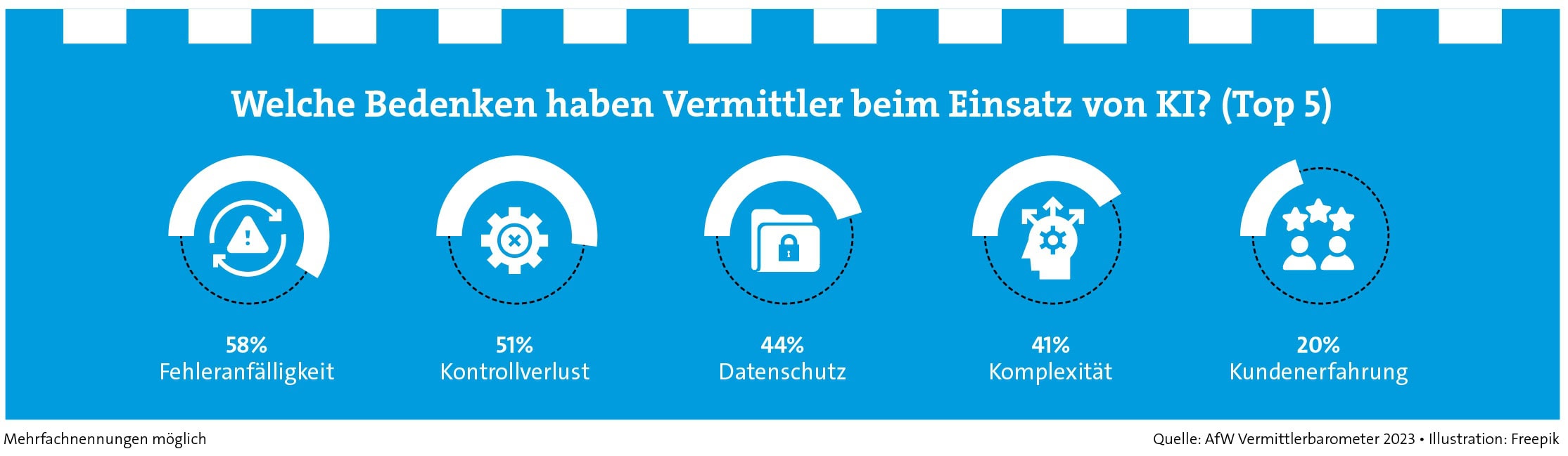 Fehleranfälligkeit und Kontrollverlust sind die beiden von Vermittelnden am häufigsten genannten Bedenken, wenn es um den Einsatz von KI geht (Grafik oben). Neben Rechtsfragen (Kann es zu Datenschutzverstößen kommen?) gehören auch die Verarbeitung falscher Daten durch die KI und deren ungeprüfte Übernahme in die Beratungsdienstleistung dazu. „Vor allem bei der ungeprüften Übernahme wird es Grenzen des Versicherungsschutzes in der Vermögensschadenhaftpflichtversicherung geben“, so Rottenbacher.