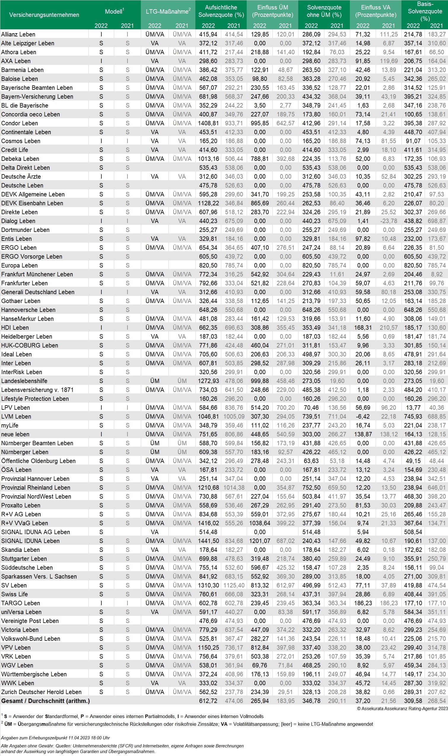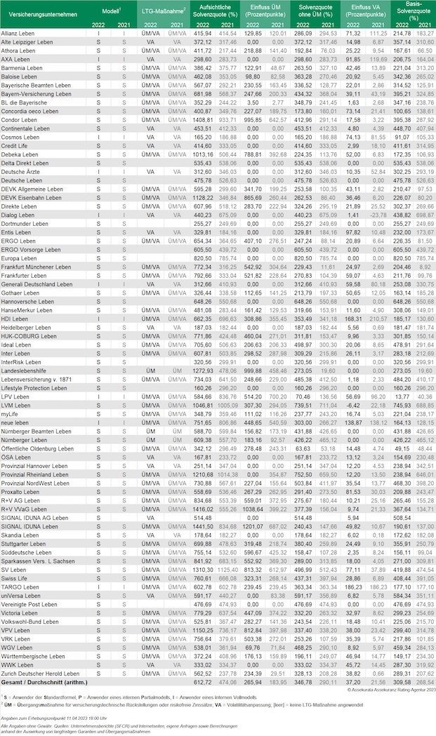 In folgender Tabelle sind die Solvenzquoten von 75 deutschen Lebensversicherern zusammengestellt, welche Assekurata nach eigenen Angaben bis zum 11. April 2023, 18:30 Uhr vorlagen.