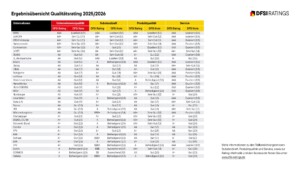 Zudem wurden weitere drei Lebensversicherer von DFSI Ratings mit „Sehr Gut“ bewertet: Hannoversche (1,2), Continentale (1,3) und LV 1871 (1,4). Das Gros der Lebensversicherer mit 25 Unternehmen erhielt die Gesamtnote „Gut“ in Abstufungen von 1,6 bis 2,5. Drei Versicherer kamen über ein „Befriedigend“ (2,6 bis 2,9) nicht hinaus.