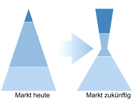 Das sorgt dafür, dass sich der Markt seit Jahren massiv verschiebt und weiter verschieben wird. Der Mittelbau, in dem sich die allermeisten Kollegen tummeln dürften, wird kleiner. Die Ränder – also der Premium- und der Economy-Bereich – nehmen zu. Der klassische „Bauchladenmakler“ stirbt aus. Übrig bleiben Unternehmen, die besonders kostengünstig arbeiten (Economy) oder besondere, teure Services (Premium) anbieten. Um in diesem Umfeld zu überleben und ertragreich zu wachsen, braucht es ein klares Geschäftsmodell.