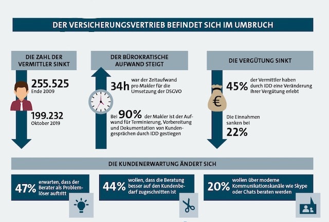 Gleichzeitig schrumpft laut Daten des DIHK die Zahl der Vermittler deutlich. Allein in den vergangenen zehn Jahren haben rund 100.000 Vermittler den Markt verlassen. Da die Bevölkerungszahl in Deutschland in etwa konstant geblieben ist, bleibt ein großer Teil der Bevölkerung zurück, die de facto unbetreut ist.