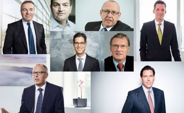 Obere Reihe (v. l.): Ralf Berndt (Stuttgarter), Markus Drews (Canada Life), Frank Kettnaker (Alte Leipziger / Hallesche), und Matthias Wald (Swiss Life). Mittlere Reihe (v. l.): Thilo Schumacher (Axa), und Claus Scharfenberg (Condor). Untere Reihe (v. l.): Christian Nuschele (Standard Life), und Tobias Warweg (HDI).