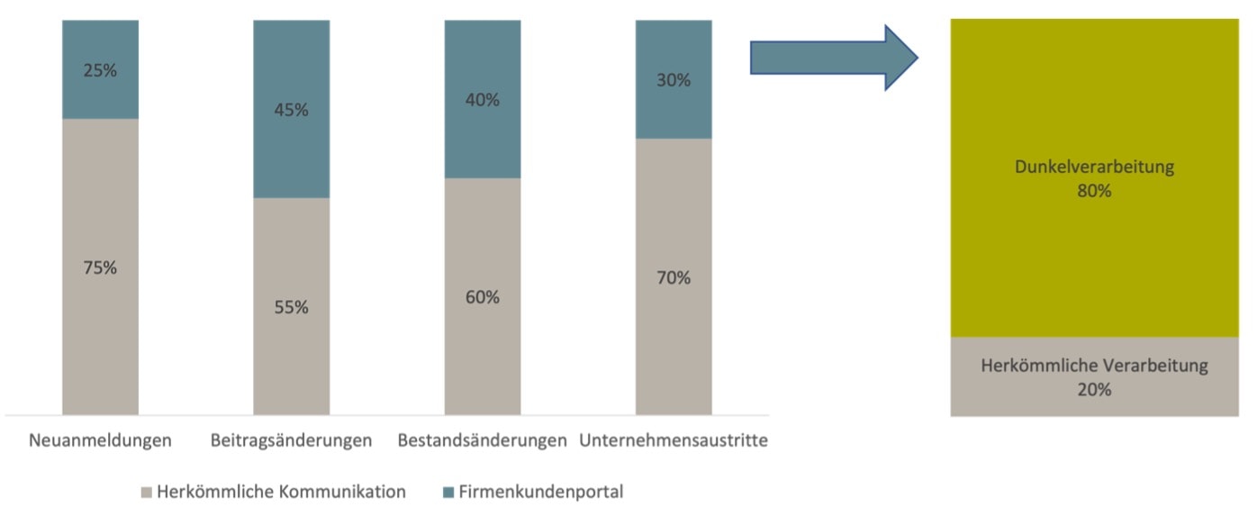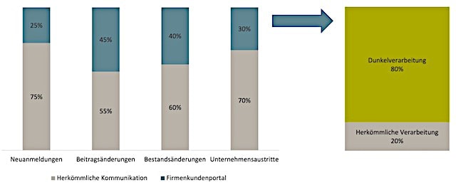 Darüber hinaus werden 45 Prozent der Beitragsänderungen und 30 Prozent der Unternehmensaustritte über das Firmenkundenportal beauftragt. Dabei ist zu erwähnen, dass die digitale Verarbeitung den Automatisierungsgrad vorantreibt und bei diesen Geschäftsvorfällen bereits eine Dunkelverarbeitungsquote von bis zu 80 Prozent erreicht werden kann. Die Verarbeitung der Geschäftsvorfälle läuft dann vollständig automatisiert, also ohne manuellen Eingriff eines Mitarbeitenden, ab. Dieses Vorgehen trägt somit positiv zur Reduktion der Kosten, Durchlaufzeiten und Fehlerquote sowie zur Erhöhung der Kundenzufriedenheit und -bindung bei.