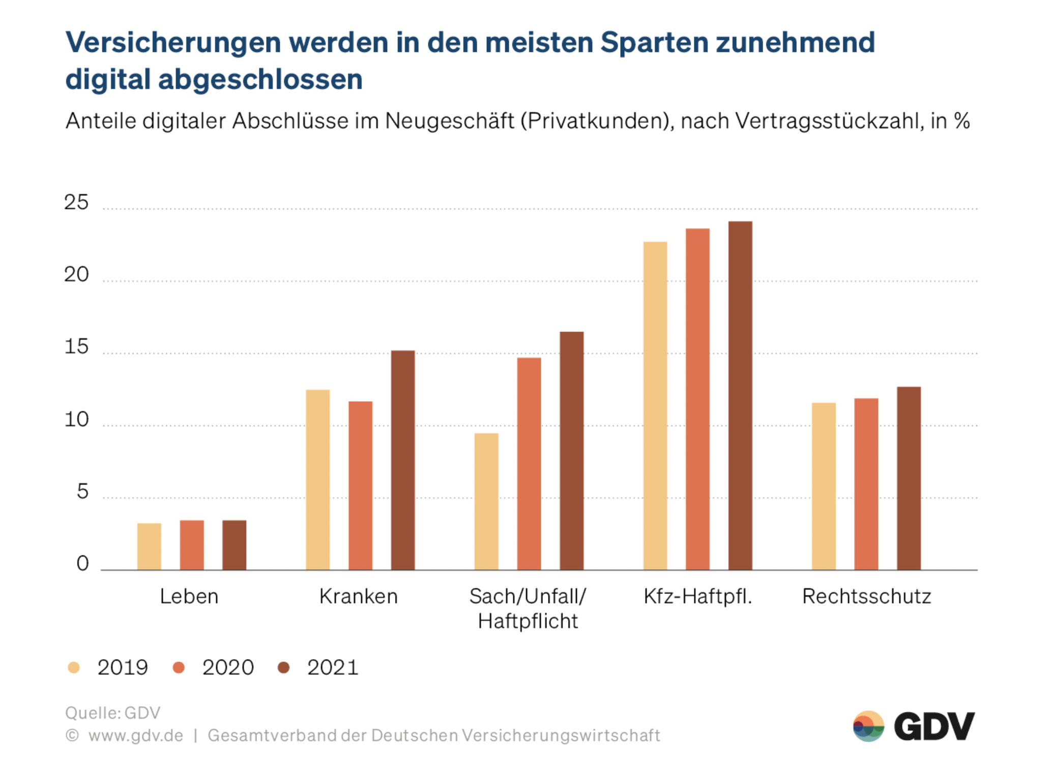 In der Rechtsschutzversicherung stieg der Anteil der digitalen Abschlüsse laut der Studie auf 12,6 Prozent (2020: 11,8 Prozent), in der Kfz-Haftpflichtversicherung gab es einen leichten Zuwachs auf 24 Prozent (2020: 23,5 Prozent).