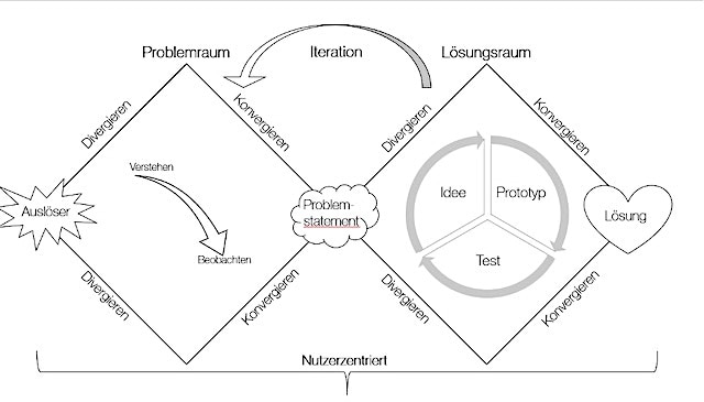 Design Thinking ist ein Ansatz zur Entwicklung von Ideen und Lösungen. Es ist kein Wundermittel, sondern ein Werkzeug, dessen zielgerichteter Einsatz hilfreich bei der Geschäftsmodellentwicklung ist. Design Thinking ist anwender- oder nutzerzentriert und problemorientiert. Ausgangspunkt sind reale, konkrete Probleme echter Menschen. Alle Lösungen richten sich an deren Bedürfnissen aus. Design Thinking ist interdisziplinär und bringt so verschiedene Perspektiven zusammen.