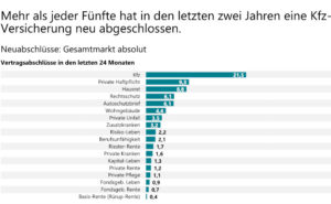 Risikolebens- und Berufsunfähigkeitsversicherungen stehen mit jeweils 2 Prozent dagegen auf einem sehr niedrigen Online-Abschlussniveau – ebenso wie Produkte der privaten Altersvorsorge (klassische und fondsgebundene Kapitallebens- und Rentenversicherungen), die jeweils auch 2 Prozent Online-Neuabschlüsse in den vergangenen zwei Jahren erreichen.
