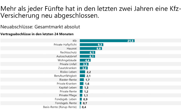 Dennoch gewinne der Online-Abschluss an Bedeutung, aber nur bei vermeintlich „einfachen“ Versicherungen wie der Kfz-, Krankenzusatz-, privaten Haftpflicht-, Hausrat- und Rechtsschutzversicherung. Bei diesen Versicherungen würden bereits 20 bis 32 Prozent online direkt oder über einen Online-Vergleich abgeschlossen.