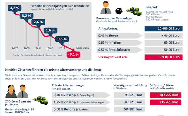 Seit Jahren hält die Niedrigzinsphase nun schon an. Die Grafik zeigt, wie sie sich auf die Vermögensbildung und private Altersvorsorge ausgewirkt hat. Und was der Ausweg aus dem Dilemma sein kann.